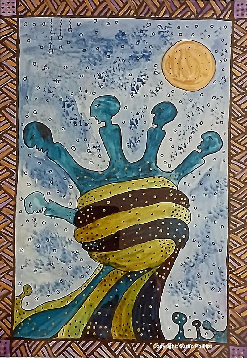 Auf dieser Blumenwiese begegnen wir den fabelhaften Wesen und Gebilden der Malerin Susan Phillips