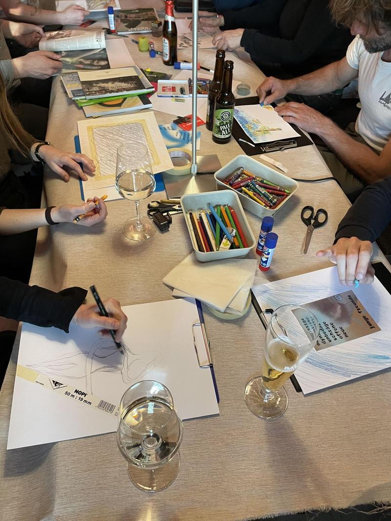 Jeden zweiten Donnerstag im Monat verwandelt sich das Gottesauer Eck in der Karlsruher Oststadt in einen kreativen Treffpunkt. Kommt vorbei auf ein Getränk und lasst Eurer Kreativität mit bereitgestelltem Zeichenmaterial freien Lauf.
