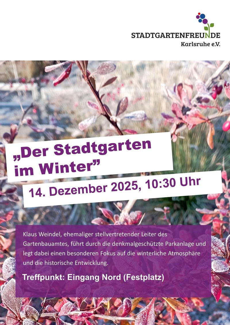 Der Verein Stadtgartenfreu(n)de Karlsruhe e.V. lädt alle interessierten Bürgerinnen und Bürger herzlich ein zu einem Rundgang durch den winterlichen Stadtgarten.