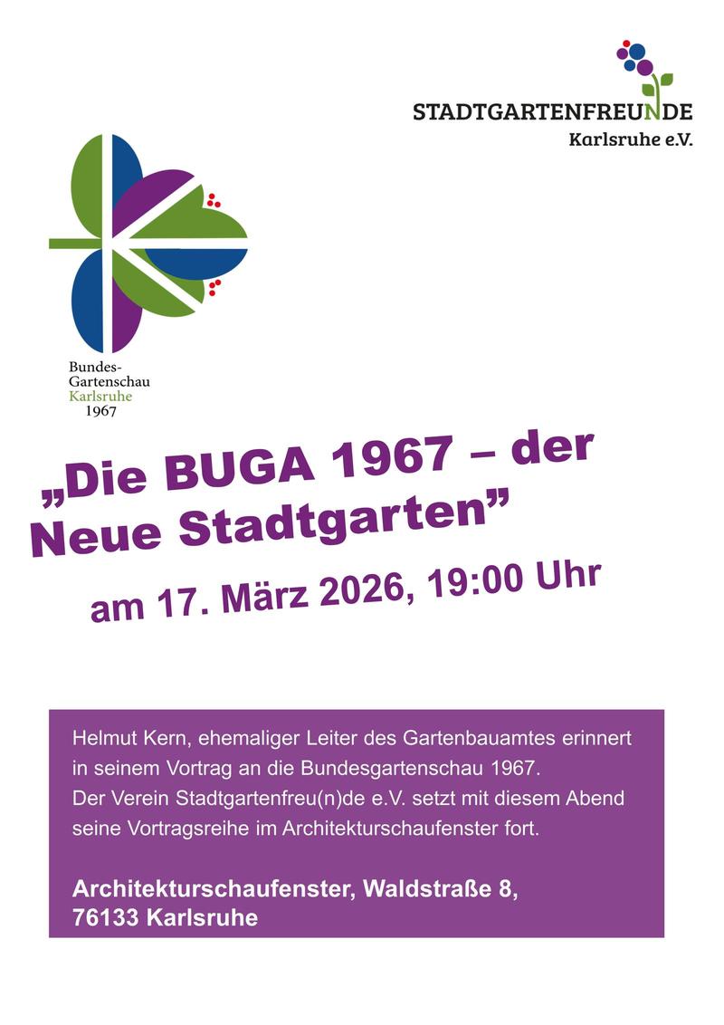 Der Verein „Stadtgartenfreu(n)de Karlsruhe e.V. , der sich im Sommer 2025 mit dem Ziel, sich für den Erhalt und die Weiterentwicklung des Stadtgartens als Parkanlage einzusetzen und in seiner Bedeutung als einzigartiger Teil der Gesamtanlage des „Zoologischen Stadtgartens“ zu stärken, hatte im September 2025 bereits in einem Vortrag die historische Entwicklung des Stadtgartens sowie die Entwicklungen in der neueren Zeit dargestellt. Mit dem Vortrag von Helmut Kern wird der Schwerpunkt auf die Bundesgartenschau gelegt.