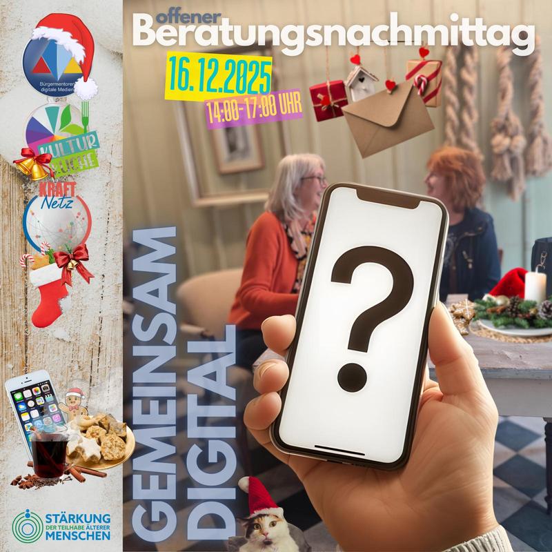 Am 16. Dezember von 14 bis 17 Uhr laden die Bürgermentorinnen und Bürgermentoren Digitale Medien gemeinsam mit dem Projekt Zukunftsweltencafé zu einem offenen Beratungstag in die Kulturküche ein.