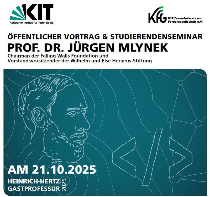 Das Karlsruher Institut für Technologie (KIT) und der KIT Freundeskreis und Fördergesellschaft e.V. (KFG) verleihen die Heinrich-Hertz-Gastprofessur 2025 an Professor Jürgen Mlynek . Mlynek war von 2005-2015 Präsident der Helmholtz Gemeinschaft und ist Chairman der Falling Walls Foundation und Vorstandsvorsitzender der Wilhelm und Else Heraeus-Stiftung.
